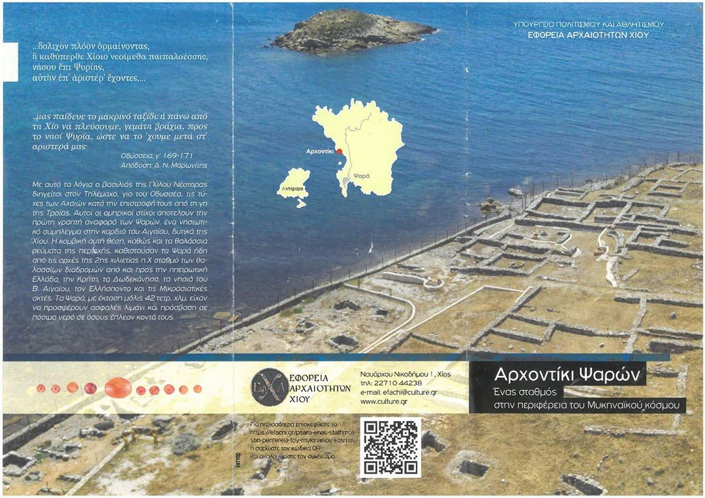 (Οι παραπάνω πληροφορίες προέρχονται από κείμενα των εκδόσεων του Υπουργείου Πολιτισμού (Κ’ Εφορεία Κλασικών και Προϊστορικών Αρχαιοτήτων) «Τα Ψαρά στην Αρχαιότητα», Αθήνα 2001, Α.Αρχοντίδου, Γ. Δεληγιώργη και «Ψαρά, Ένας σταθμός στην Περιφέρεια του Μυκηναικού Κόσμου», Μυτιλήνη 2008 , Α. Αργύρη, Α. Αρχοντίδου, Γ.Βαβλιάκης, Μ. Γρηγοριάδου, Γ. Δεληγιώργη, Σ. Αηδόνης, Φ. Λύρου, Α. Πανάτση, Δ. Πίτσιου, Κ. Ρούγγου, Γ. Μπίρτσας, Λ. Σουχλέρης).