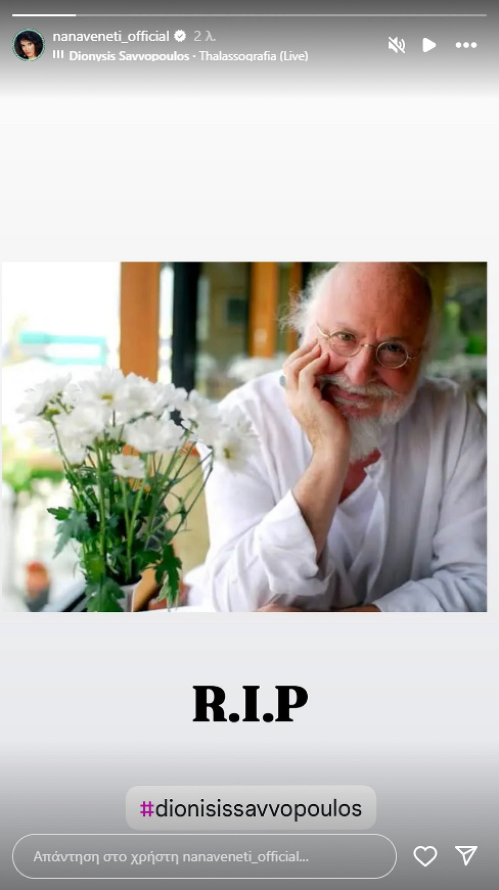 Με μια νοσταλγική ανάρτηση αποχαιρέτησε τον καλλιτέχνη και η Φωτεινή Δάρρα, αναπολώντας τα εφηβικά της χρόνια. «Μια κασέτα παλιά έπαιζε συνέχεια στο κασετόφωνο του δωματίου μου. Ήμουν στην τελευταία τάξη του Λυκείου και είχα ήδη αποφασίσει ότι θα σπούδαζα θέατρο. Πού να ήξερα ότι θα γινόμουν μια ηθοποιός που τραγουδάει», έγραψε αρχικά και συνέχισε: «Κι όλα αυτά με τους ήχους από τους Αχαρνείς του Αριστοφάνη και του Διονύση Σαββοπουλου». Στο τέλος της ανάρτησης σημείωσε: «Αντίο Νιόνιο. Τελικά τα χρόνια έτρεξαν χύμα. Τέλος εποχής».