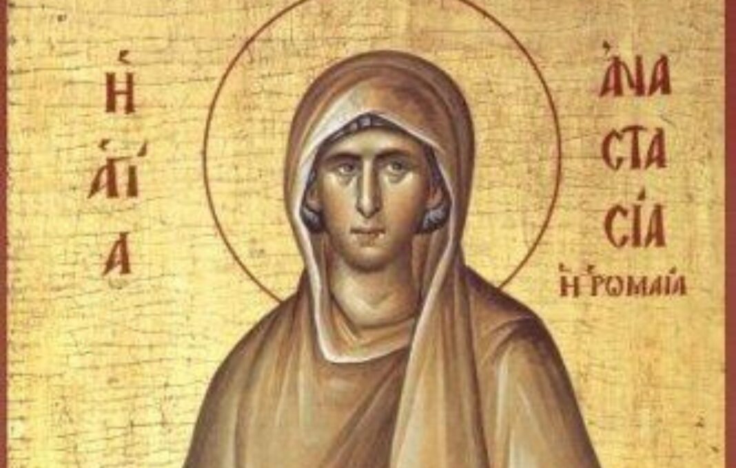 Η Αγία Αναστασία η Ρωμαία, η οσιομάρτυς, καταγόταν από την αριστοκρατική Ρώμη του 3ου αιώνα και διακρίθηκε για την πίστη και την αρετή της. Αφού οι πλούσιοι γονείς της απεβίωσαν, μοίρασε την περιουσία στους φτωχούς και επέλεξε τον μοναχικό βίο σε ηλικία είκοσι ετών, υπό τη φροντίδα της γερόντισσας Σοφίας. Η ζωή της ήταν γεμάτη ασκητικούς κόπους, προσευχή και αληθινή αφοσίωση στο Χριστό. Με τις αρετές και τη γενναιότητά της προσείλκυε το φθόνο των ειδωλολατρών, που τη συκοφάντησαν ως οπαδό του Χριστού.