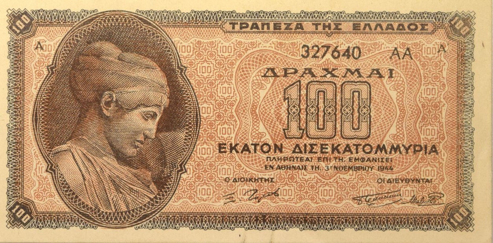 1944: Κυκλοφορεί το μεγαλύτερο σε ονομαστική αξία ελληνικό χαρτονόμισμα των 100 δισεκατομμυρίων δραχμών, το οποίο φέρει την υπογραφή του διοικητή της Τραπέζης της Ελλάδος, Ξενοφώντα Ζολώτα.