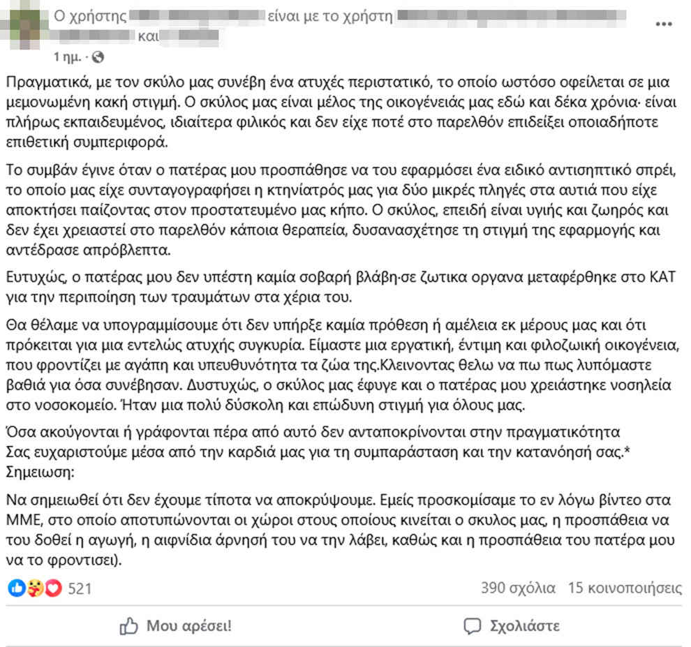 Ο γιος του 76χρονου ξεκινά την ανάρτησή του, λέγοντας: «Πραγματικά, με τον σκύλο μας συνέβη ένα ατυχές περιστατικό, το οποίο ωστόσο οφείλεται σε μια μεμονωμένη κακή στιγμή. Ο σκύλος μας είναι μέλος της οικογένειάς μας εδώ και δέκα χρόνια, είναι πλήρως εκπαιδευμένος, ιδιαίτερα φιλικός και δεν είχε ποτέ στο παρελθόν επιδείξει οποιαδήποτε επιθετική συμπεριφορά».