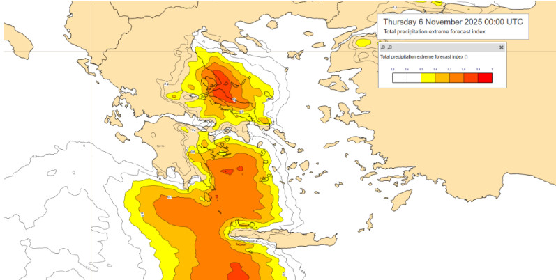 Ο δείκτης EFI υποδεικνύει ακραία φαινόμενα, ενώ προειδοποιείται αυξημένος κίνδυνος πλημμυρών, κατολισθήσεων και διαβρώσεων, ιδίως σε περιοχές με έντονο ανάγλυφο και χαμηλή υδροχωρητικότητα.