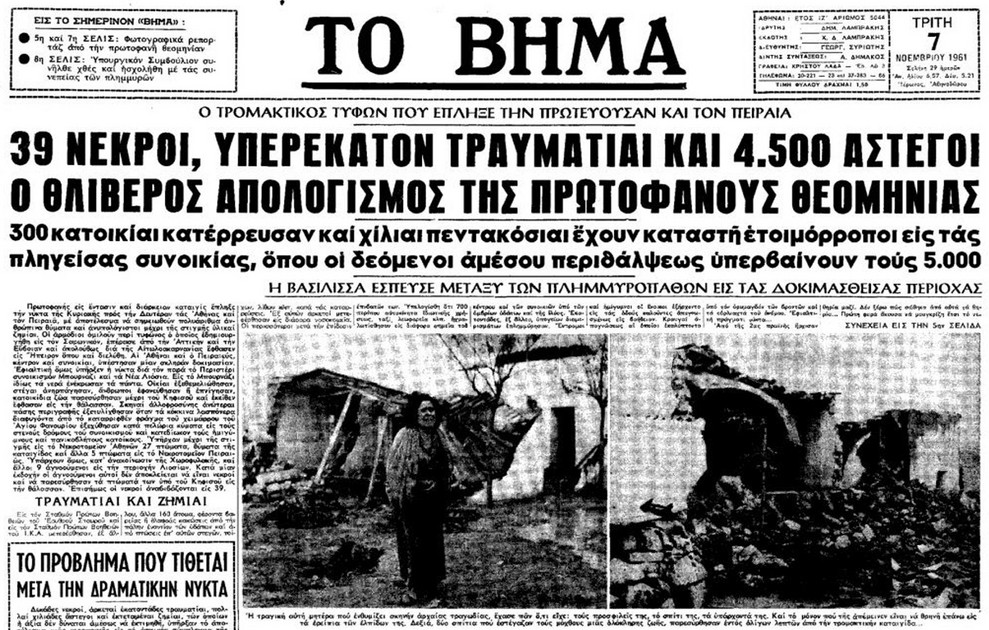 - Στις 5 Νοεμβρίου 1961, η Αθήνα πλήττεται από καταστροφική πλημμύρα που προκαλεί το θάνατο 43 ανθρώπων και χιλιάδες άστεγους.