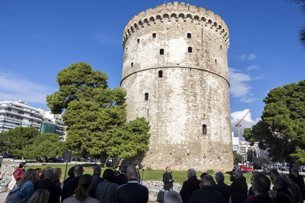 Σήμερα τιμούμε όχι μόνο ένα μνημείο φτιαγμένο από πέτρα και χρόνο, αλλά κι ένα ορόσημο των κινούμενων εικόνων, που γεφυρώνει την ιστορική κληρονομιά με την κινηματογραφική παρακαταθήκη. Ο Λευκός Πύργος, μέσα από την ποιητική ματιά του Θόδωρου Αγγελόπουλου, έγινε κάτι παραπάνω από ένα εμβληματικό μνημείο. Έγινε φορέας μνήμης και κιβωτός της ελληνικής ψυχής. Στον κινηματογράφο του Αγγελόπουλου ο Λευκός Πύργος υπερέβη τη λειτουργία του απλού φόντου, καθώς υπήρξε μάρτυρας της ιστορίας, της εξορίας, του αιώνιου ανθρώπινου δράματος, θυμίζοντάς μας τη μεταμορφωτική δύναμη του κινηματογράφου και τον τρόπο με τον οποίο διαφυλάσσει την εύθραυστη ισορροπία της μνήμης και της συλλογικής συνείδησης. Στην εποχή μας εξάλλου, περισσότερο από ποτέ άλλοτε, είναι ουσιαστικό να θυμόμαστε τις ιστορίες του παρελθόντος” υπογράμμισε. Ακολούθησαν οι τοποθετήσεις της Αθηνάς Καρτάλου και του Αναστάσιου Αντωνάρα, ενώ στη συνέχεια έγινε εκτενής αναδρομή στις ιστορικές καταβολές του Λευκού Πύργου και την πορεία του ανά τους αιώνες, φτάνοντας μέχρι τη σημερινή εποχή.