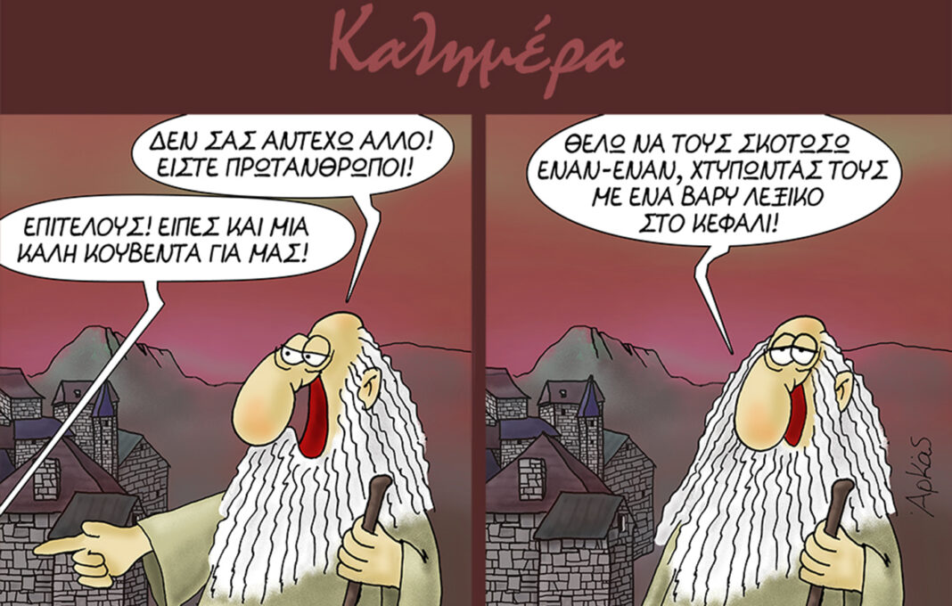 Ο γνωστός σκιτσογράφος παρουσιάζει έναν «σοφό» γέροντα ο οποίος εμφανώς εκνευρισμένος από το πλήθος γύρω του φωνάζει: «Δεν σας αντέχω άλλο! Είστε πρωτάνθρωποι!».