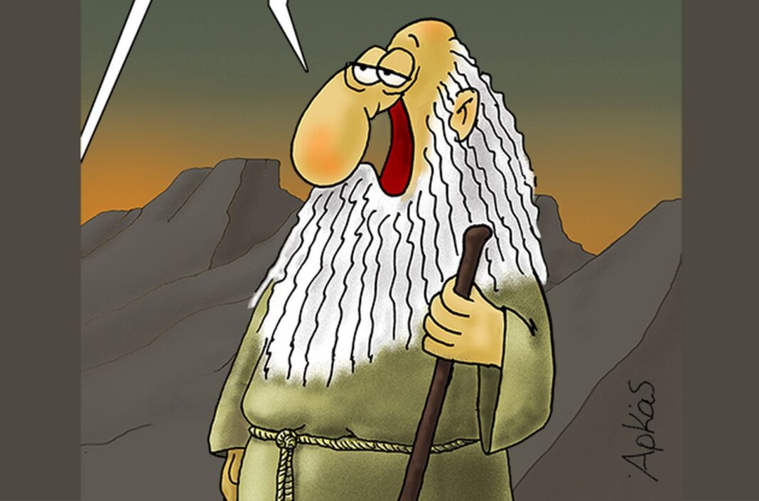 Στο σκίτσο, ο Προφήτης του Αρκά έχει τον εξής διάλογο με τον κόσμο: