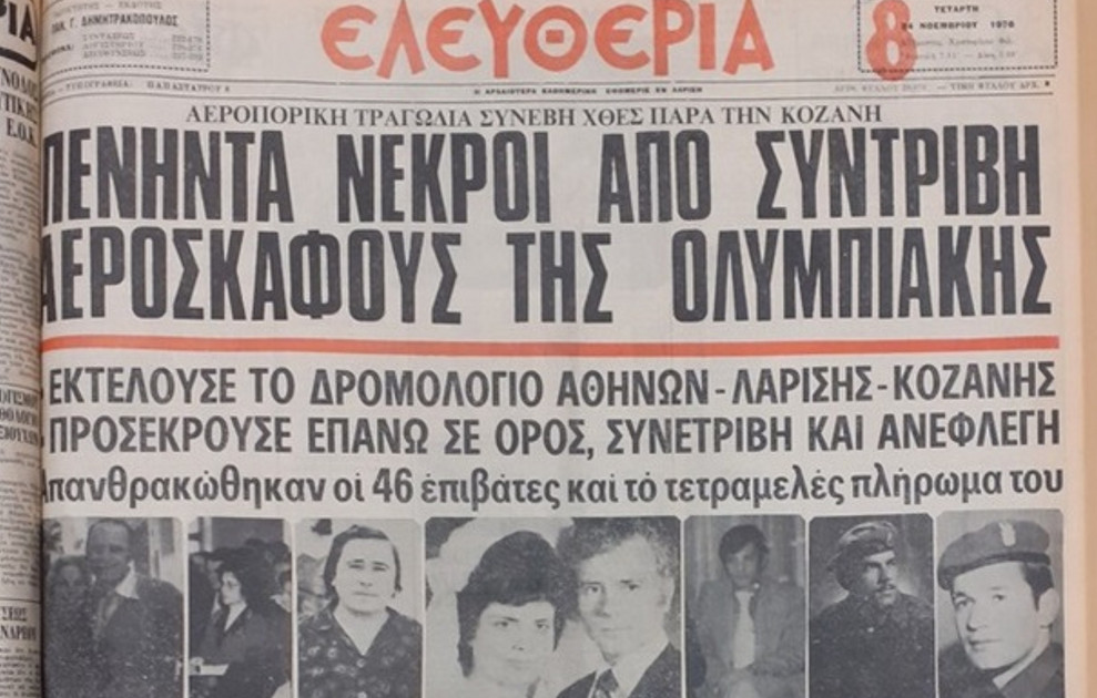 1976: Ελικοφόρο αεροπλάνο της Ολυμπιακής Αεροπορίας τύπου YS-11A συντρίβεται κοντά στην Κοζάνη, παρασύροντας στον θάνατο και τους 50 επιβαίνοντες. Το δυστύχημα, ένα από τα πιο πολύνεκρα στην ιστορία της ελληνικής πολιτικής αεροπορίας, προκαλεί σοκ στη χώρα και οδηγεί σε εκτεταμένη έρευνα για τα αίτια της πτώσης και τα ζητήματα ασφάλειας στις πτήσεις εσωτερικού.