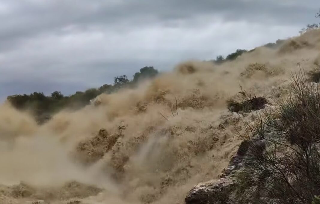 Η στάθμη του νερού στο ρέμα αυξήθηκε σημαντικά, δημιουργώντας ορμητικά ρεύματα που μεταφέρουν φερτά υλικά, όπως φαίνεται και σε βίντεο που δημοσίευσε η ιστοσελίδα Agriniopress.