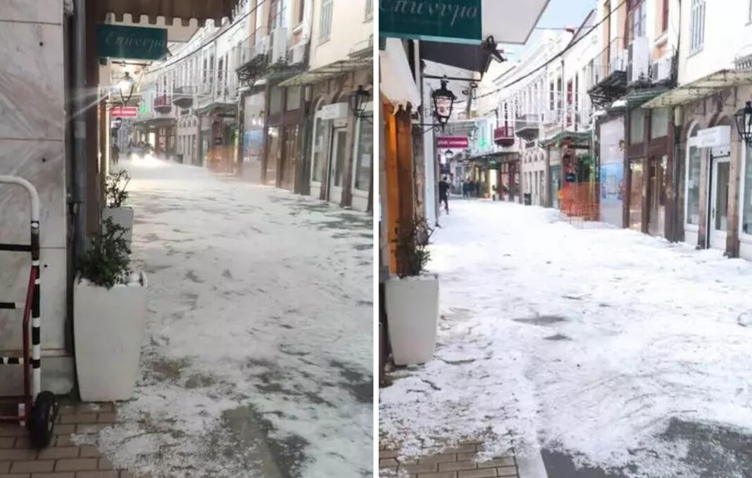 Το έντονο χαλάζι στην οδό Ερμού προκάλεσε φραγή στα φρεάτια, με αποτέλεσμα τα νερά να συσσωρευτούν και μέσα σε λίγα λεπτά να πλημμυρίσουν αρκετά καταστήματα.