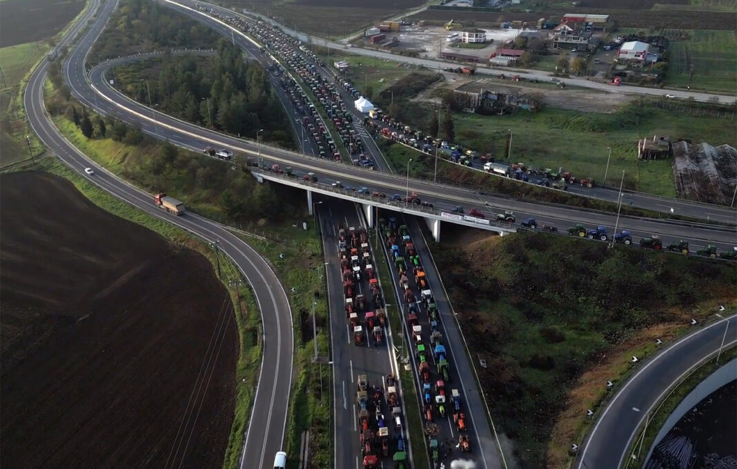 Εκατοντάδες τρακτέρ έχουν παραταχθεί σε πυκνούς σχηματισμούς, κλείνοντας τον νευραλγικό οδικό άξονα και στέλνοντας το δικό τους μήνυμα στην κυβέρνηση.