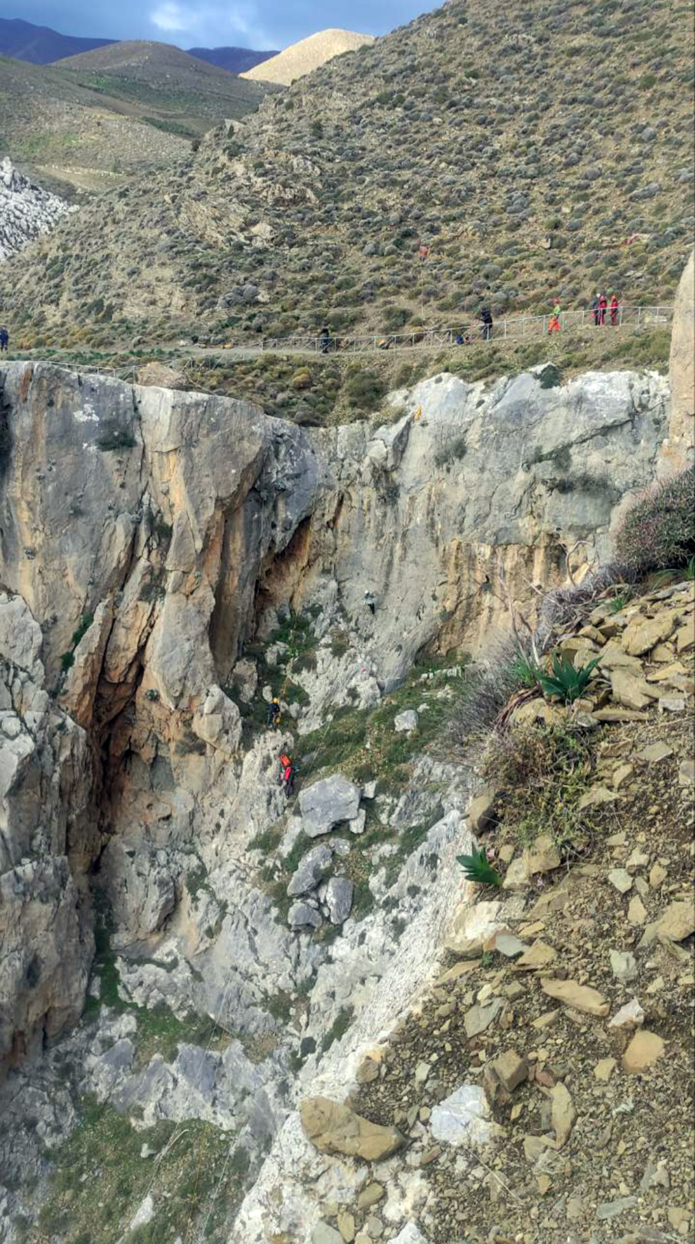 Οι δυνάμεις διάσωσης -πυροσβεστική, ΕΜΑΚ και δασοκομάντος- βρέθηκαν άμεσα στο σημείο, αλλά η δυσκολία της προσέγγισης ήταν μεγάλη, με αποτέλεσμα να ζητηθεί συνδρομή από το ελικόπτερο Super Puma. Το πρωί της Δευτέρας, όμως, διαπιστώθηκε ότι ούτε το ελικόπτερο μπορούσε να φτάσει στο ιδιαίτερα δύσβατο σημείο, κι έτσι ξεκίνησε μια δύσκολη επιχείρηση από τους διασώστες.