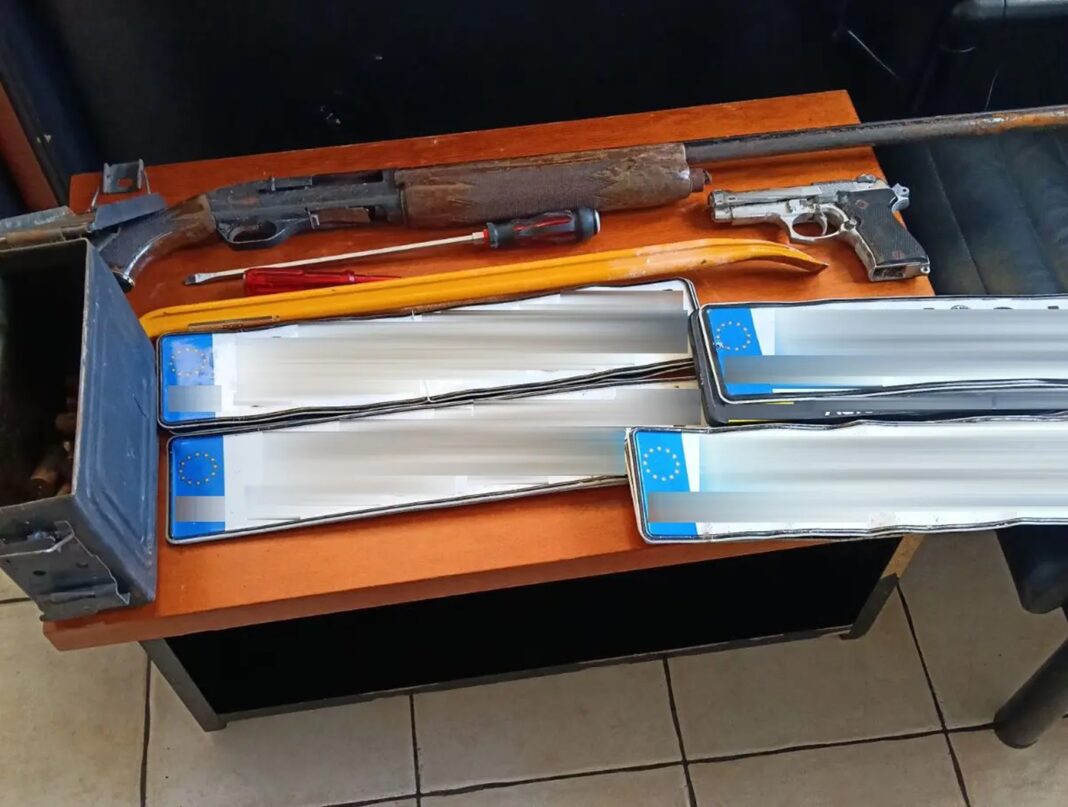 • Κατά τις έρευνες κατασχέθηκαν όπλα, φυσίγγια, διαρρηκτικά εργαλεία και πολλές κλεμμένες πινακίδες αυτοκινήτων.