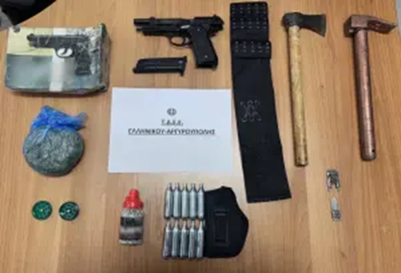 Στην κατοχή του βρέθηκαν αεροβόλο πιστόλι, τσεκούρι, σκεπάρνι, μαχαίρι-μπρελόκ, 52 γραμμ. ακατέργαστης κάνναβης και 1500 σφαίρες αεροβόλου πιστολιού.