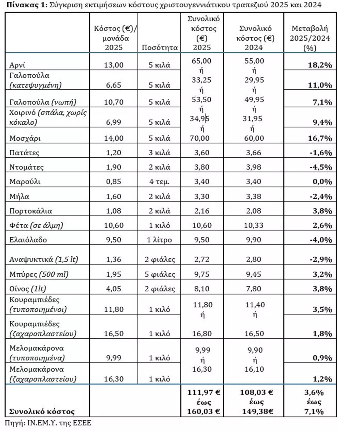 Ακριβότερο θα είναι φέτος το χριστουγεννιάτικο τραπέζι, σύμφωνα με έρευνα αγοράς που πραγματοποίησε το Ινστιτούτο Εμπορίου και Υπηρεσιών της Ελληνικής Συνομοσπονδίας Εμπορίου και Επιχειρηματικότητας (ΙΝ.ΕΜ.Υ.-ΕΣΕΕ).