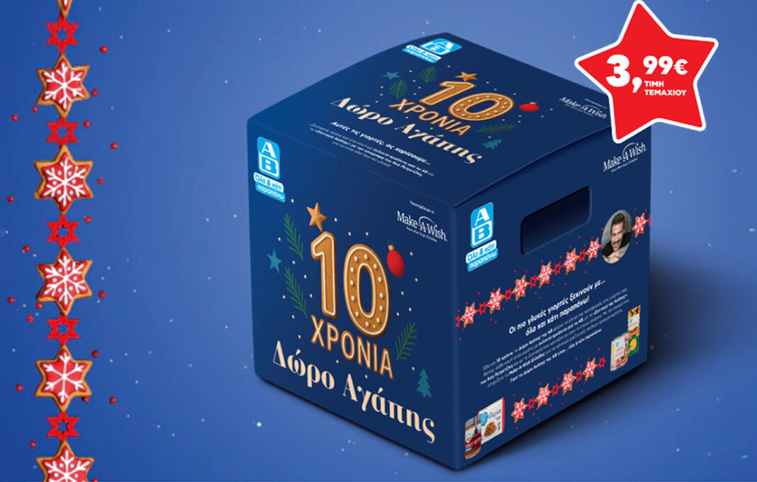 Φέτος, με αφορμή τη συμπλήρωση δέκα χρόνων, το «Δώρο Αγάπης» αποκτά επετειακό χαρακτήρα και έναν ακόμη πιο βαθύ συμβολισμό. Με κάθε αγορά του «Δώρου Αγάπης» της ΑΒ, οι καταναλωτές στηρίζουν το έργο του Make-A-Wish Ελλάδος, συμβάλλοντας στην πραγματοποίηση ευχών παιδιών που νοσούν σοβαρά.