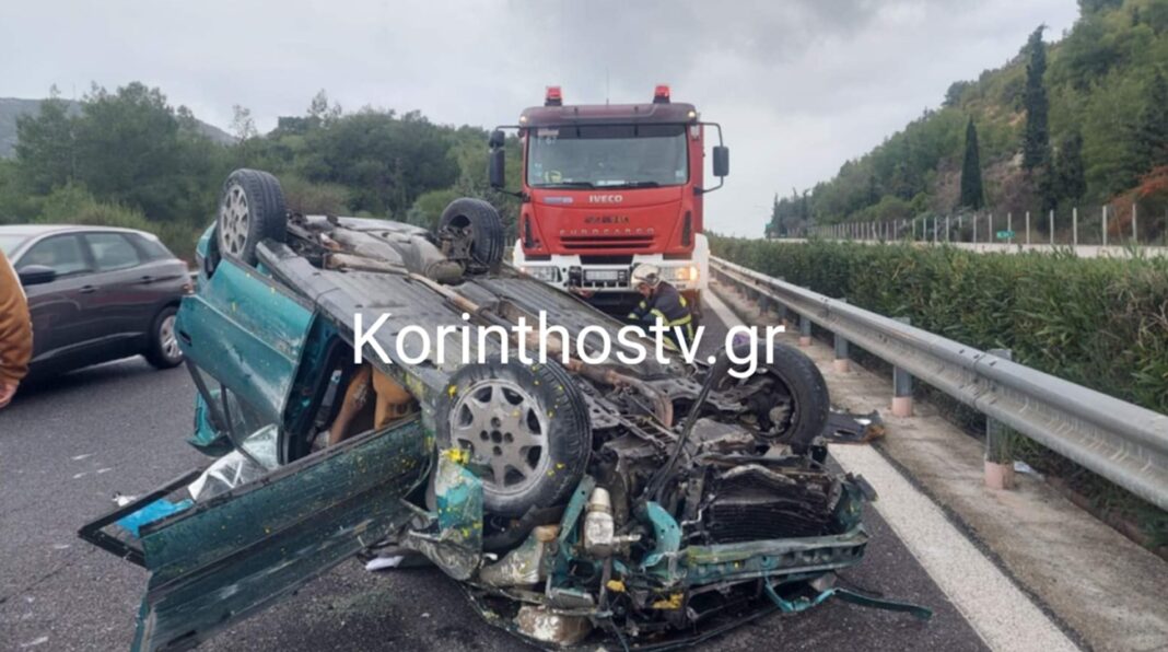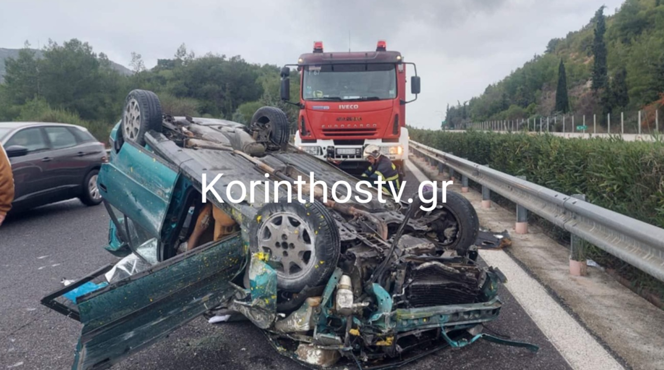 Το όχημα, σύμφωνα με το korinthostv.gr, εξετράπη της πορείας του και ανετράπη, με αποτέλεσμα να εγκλωβιστούν οι επιβαίνοντες.