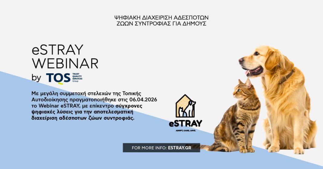 Με ιδιαίτερα μεγάλη συμμετοχή και έντονο ενδιαφέρον από στελέχη της Τοπικής Αυτοδιοίκησης πραγματοποιήθηκε στις 06.04.2026 το εξειδικευμένο webinar με αντικείμενο τη σύγχρονη διαχείριση των αδέσποτων ζώων συντροφιάς και την αξιοποίηση ψηφιακών εργαλείων, με επίκεντρο την πλατφόρμα eStray.