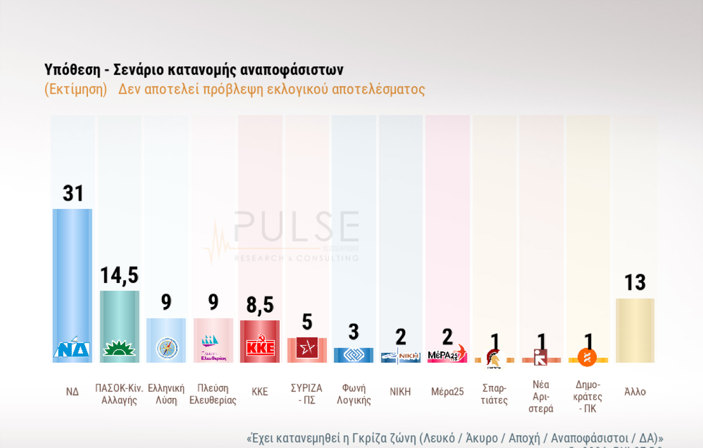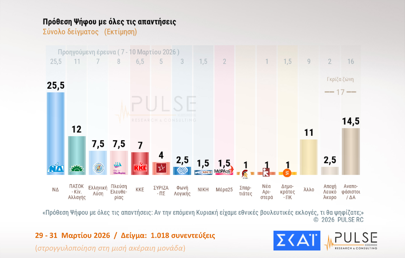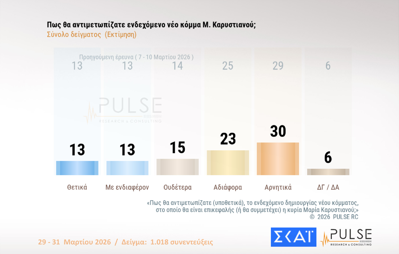Η δημοσκόπηση της Pulse διεξήχθη το διάστημα 29-31 Μαρτίου, λίγο πριν η Μαρία Καρυστιανού ανακοινώσει το κόμμα της.