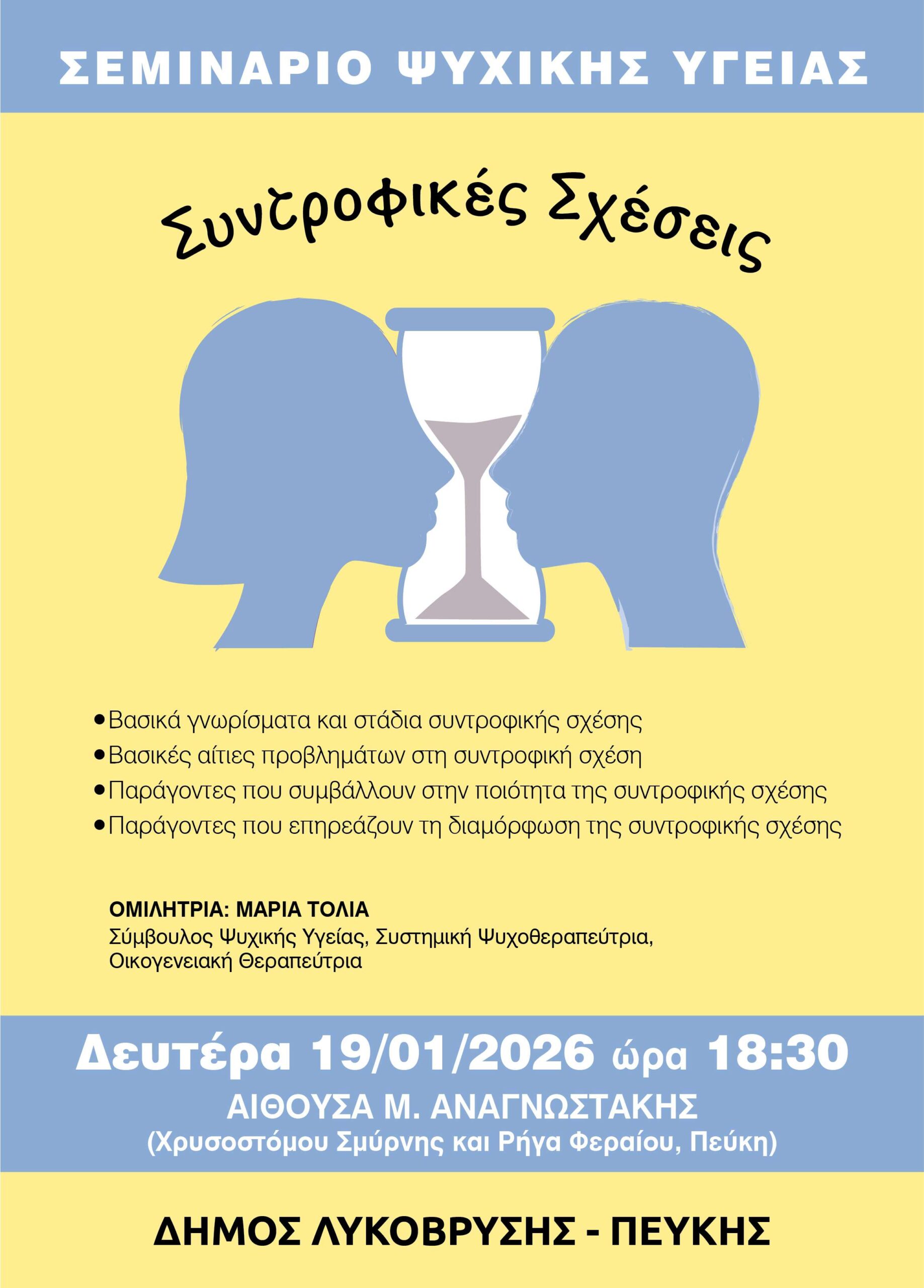 Ομιλήτρια θα είναι η Μαρία Τόλια, Σύμβουλος Ψυχικής Υγείας, Συστημική Ψυχοθεραπεύτρια, Οικογενειακή Θεραπεύτρια, η οποία θα αναπτύξει θέματα γύρω από τον τομέα των Συντροφικών Σχέσεων, όπως ενδεικτικά: