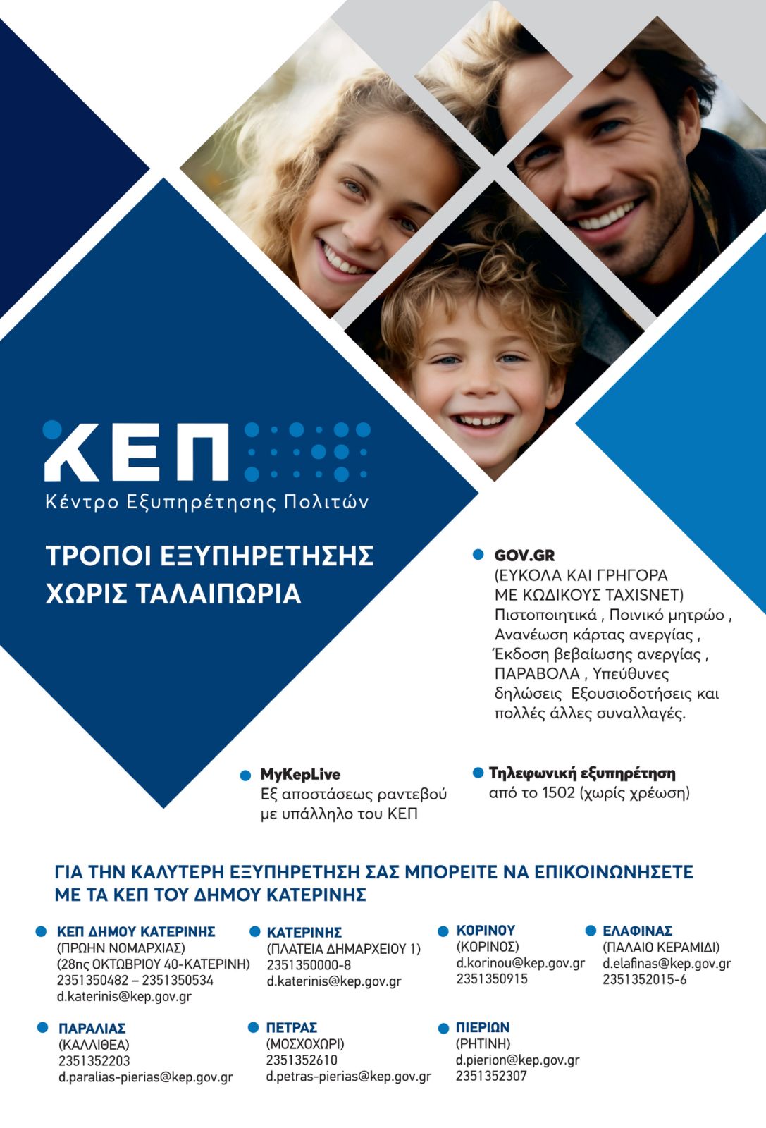 Το έντυπο παρουσιάζει συγκεντρωμένα όλα τα διαθέσιμα εργαλεία εξ αποστάσεως εξυπηρέτησης, όπως η πλατφόρμα MyKeplive για βιντεοκλήση με υπάλληλο του ΚΕΠ, η χρήση του gov.gr με κωδικούς Taxisnet για την έκδοση πιστοποιητικών, υπεύθυνων δηλώσεων, εξουσιοδοτήσεων, παραβόλων και άλλων συναλλαγών, καθώς και η τηλεφωνική εξυπηρέτηση μέσω της γραμμής 1502 χωρίς χρέωση. Παράλληλα, περιλαμβάνει αναλυτικά τα στοιχεία επικοινωνίας όλων των ΚΕΠ του Δήμου Κατερίνης (ΚΕΠ Δημοτικού Καταστήματος, Παραλίας, Κατερίνης, Πέτρας, Κορινού, Πιερίων, Ελαφίνας), διευκολύνοντας τους δημότες να απευθυνθούν άμεσα στην υπηρεσία που τους εξυπηρετεί.