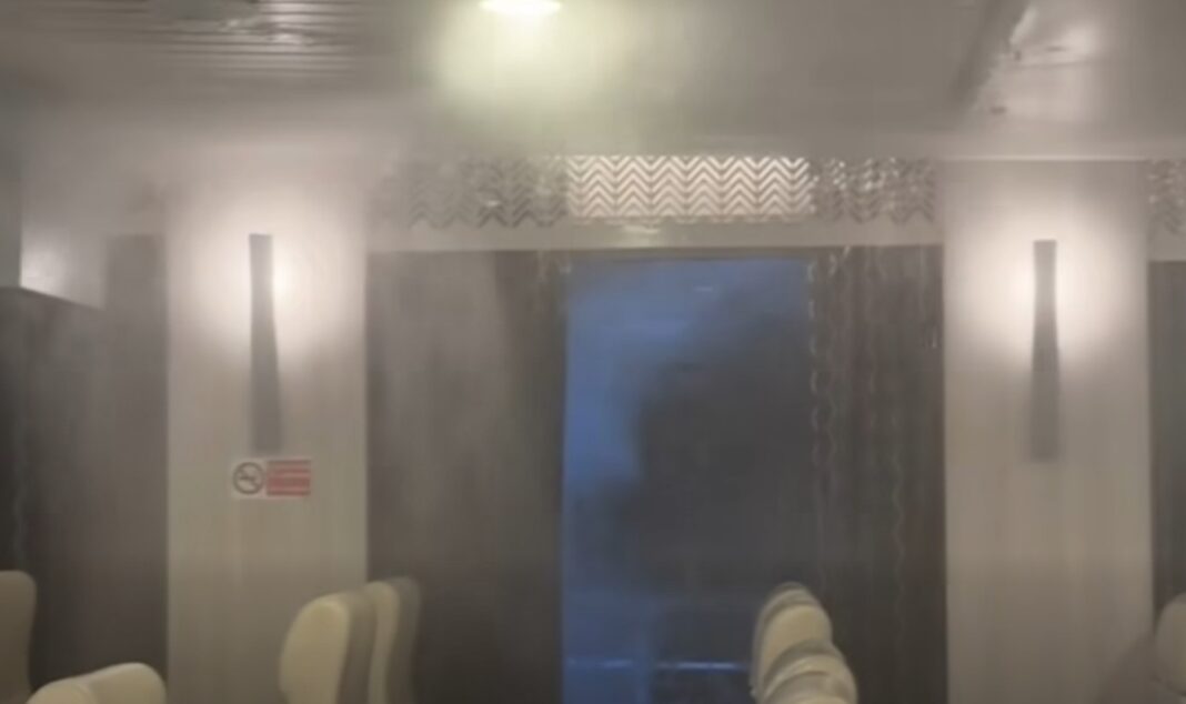Όπως φαίνεται στα πλάνα, μεγάλες ποσότητες νερού εκτοξεύονται στο εσωτερικό του πλοίου, προκαλώντας αναστάτωση και πανικό στους επιβάτες, οι οποίοι αιφνιδιάζονται από την εξέλιξη.