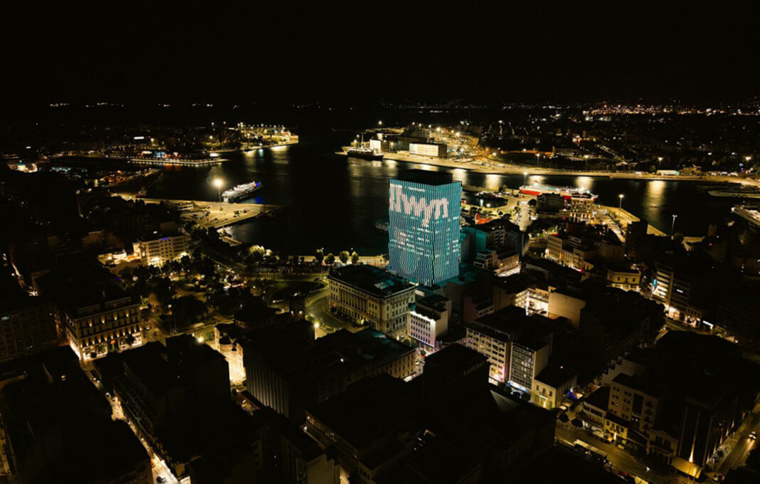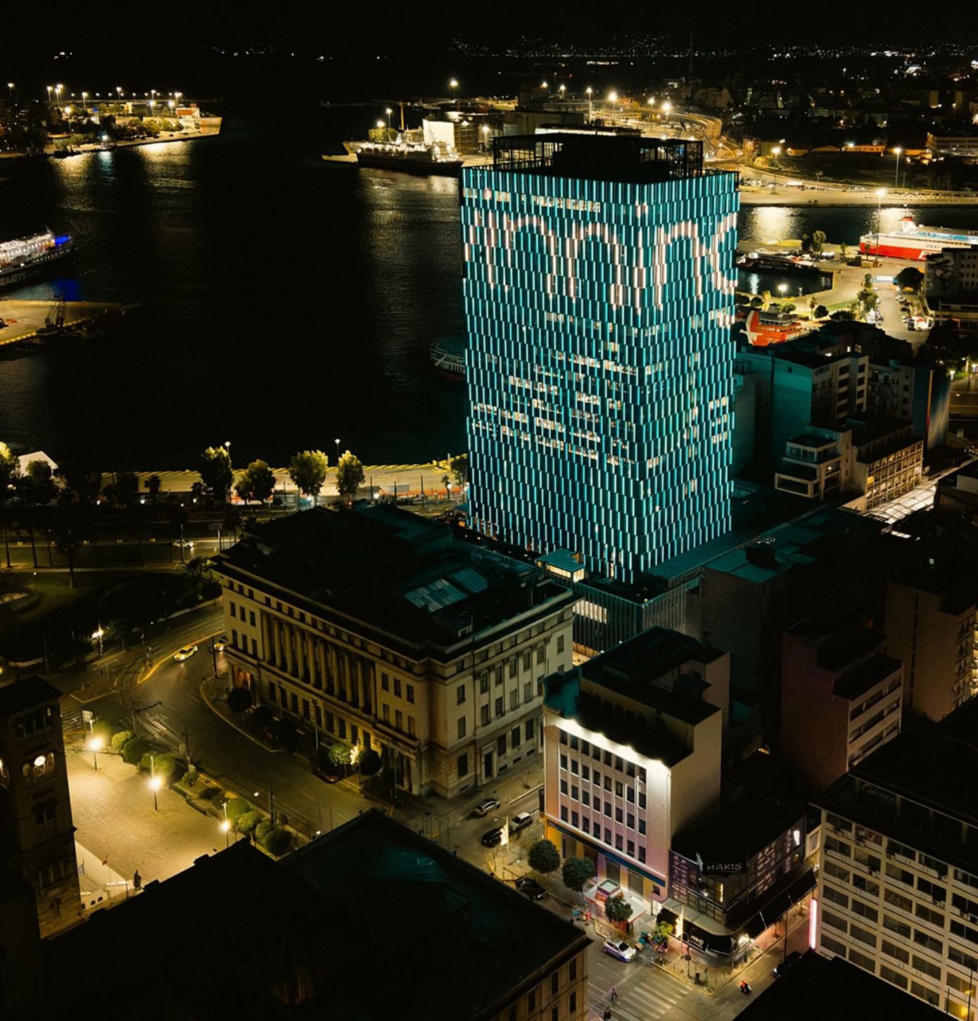 Σε αυτή τη σκηνή, ο φωταγωγημένος Πύργος στον Πειραιά λειτουργεί σαν «καμβάς» της νέας ταυτότητας: ένα τοπόσημο που αλλάζει όψη, γεμίζει χρώμα και δίνει τον τόνο της μετάβασης.