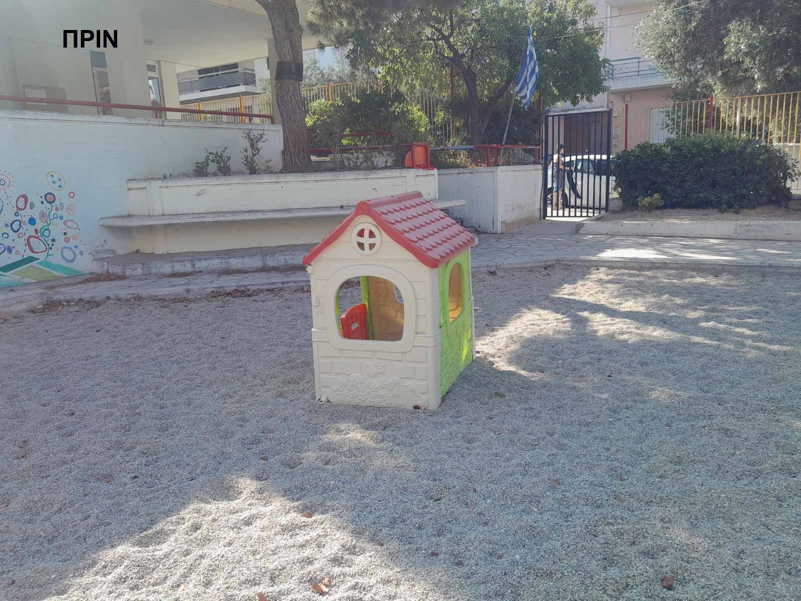Η αυλή του νηπιαγωγείου παρουσίαζε πριν την ανακατασκευή σημαντικές φθορές, ενώ το δάπεδο της αυλής ήταν στρωμένο με χαλίκι που λόγω της τριβής του την ώρα του διαλείμματος προκαλούσε σκόνη η οποία αιωρείτο και εισπνεόταν από μαθητές και εκπαιδευτικούς. Επιπροσθέτως, το χαλίκι αποτελούσε πόλο έλξης για τα αδεσποτάκια της περιοχής, δημιουργώντας σοβαρό πρόβλημα υγιεινής για τους μαθητές.