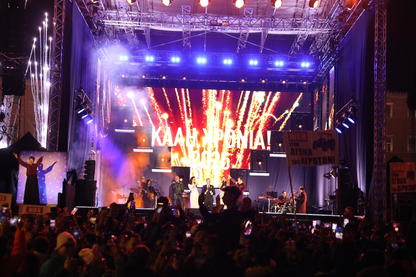 Όταν έφτασε η ώρα για την αλλαγή του χρόνου, ο δήμαρχος Αθηναίων Χάρης Δούκας ανέβηκε στη σκηνή της πλατείας, ευχήθηκε για τη νέα χρονιά, μίλησε για «την Αθήνα που ενώνει» και μαζί με τους καλλιτέχνες έκανε την αντίστροφη μέτρηση για τον ερχομό του 2026.