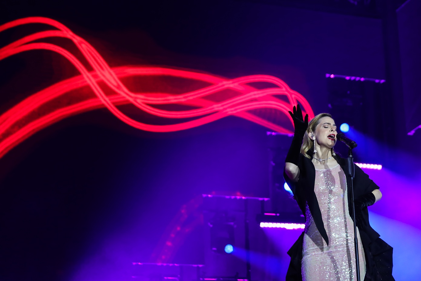Ταυτόχρονα, στον ουρανό εκατοντάδες drones δημιούργησαν ένα σόου με φωτεινά σχέδια, ενώ στο τέλος σχημάτισαν και το πρόσωπο του Διονύση Σαββόπουλου, καθώς πάνω στη σκηνή τραγούδησαν και δύο δικά του τραγούδια ως έναν μικρό φόρο τιμής.