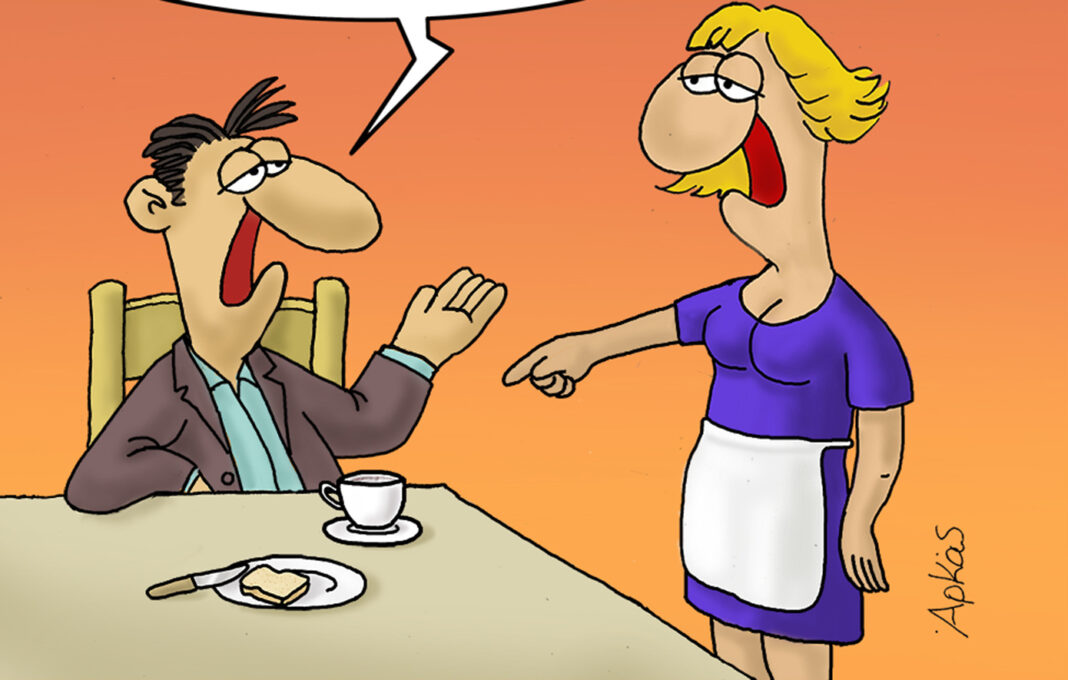 Στο σημερινό του σκίτσο, ο Αρκάς απεικονίζει έναν κύριο να παίρνει το πρωινό του και να πίνει τον καφέ του, ντυμένος και έτοιμος για να πάει στη δουλειά, ωστόσο παρουσιάζεται πολύ νυσταγμένος. Η γυναίκα του, αφού βλέπει ότι ο πρώτος του καφές τελείωσε, τον ρωτά: «Θες άλλον καφέ;».