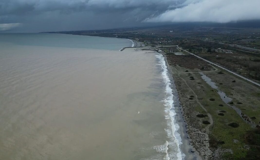 Η χαρακτηριστική διχρωμία στα νερά αντικατοπτρίζει το μέγεθος της καταστροφής, ενώ η κακοκαιρία έχει προκαλέσει σοβαρές ζημιές σε αγροτικές περιοχές και στο οδικό δίκτυο της Πιερίας.