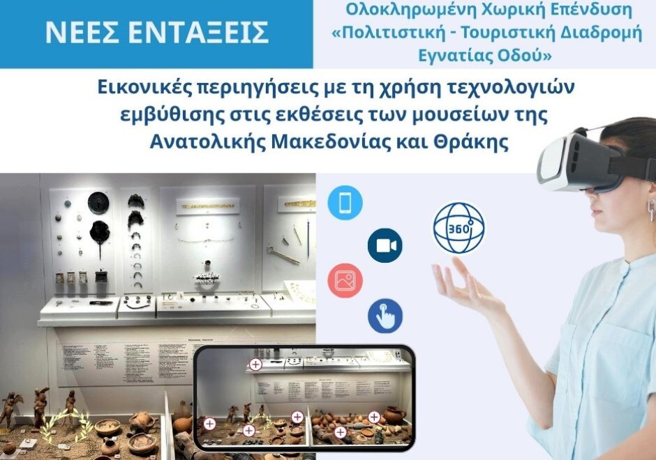 Με απόφαση του Περιφερειάρχη Ανατολικής Μακεδονίας και Θράκης κ. Χριστόδουλου Τοψίδη, εντάχθηκε στο Πρόγραμμα «Ανατολική Μακεδονία, Θράκη» 2021-2027 η πράξη της Ολοκληρωμένης Χωρικής Επένδυσης «Πολιτιστική – Τουριστική Διαδρομή Εγνατίας Οδού», με τίτλο «Εικονικές περιηγήσεις με τη χρήση τεχνολογιών εμβύθισης στις εκθέσεις των μουσείων της Ανατολικής Μακεδονίας και Θράκης», συνολικού προϋπολογισμού 1.311.360 ευρώ.