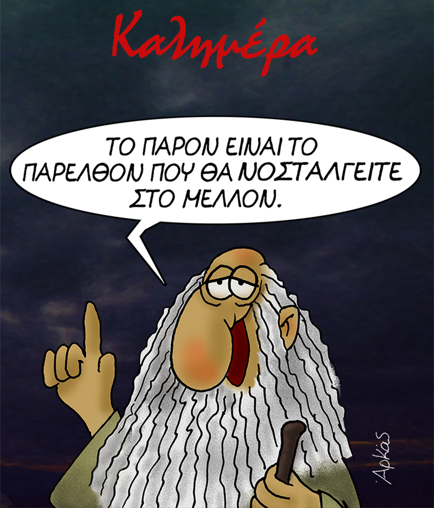 Ο Αρκάς μας καλεί να σκεφτούμε τη σημασία του παρόντος, με ένα σκίτσο που συνδυάζει χιούμορ και φιλοσοφία, προετοιμάζοντας μας για το Σαββατοκύριακο.