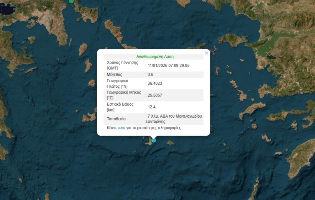 Σεισμός 3,6 της κλίμακας Ρίχτερ σημειώθηκε το πρωί της Κυριακής 11 Ιανουαρίου στη θαλάσσια περιοχή της Σαντορίνης, σύμφωνα με την αναθεωρημένη λύση του Γεωδυναμικού Ινστιτούτου.