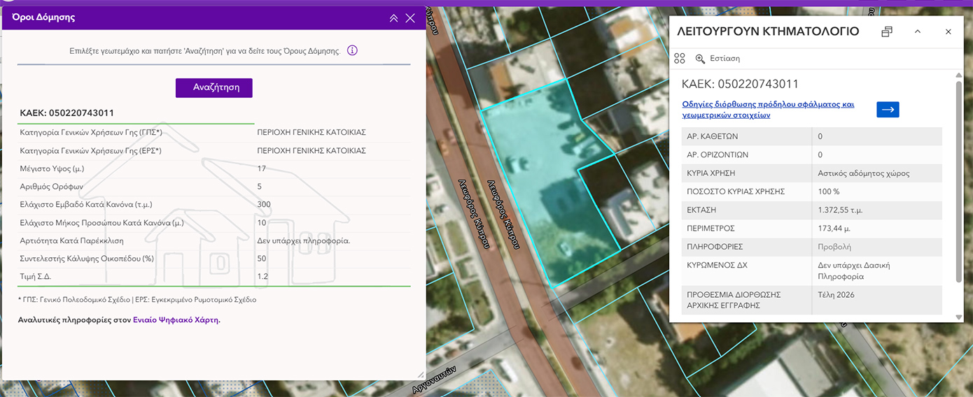 Η εμφάνιση των δεδομένων βασίζεται στη διαθεσιμότητα των πολεοδομικών πληροφοριών στον Ενιαίο Ψηφιακό Χάρτη.