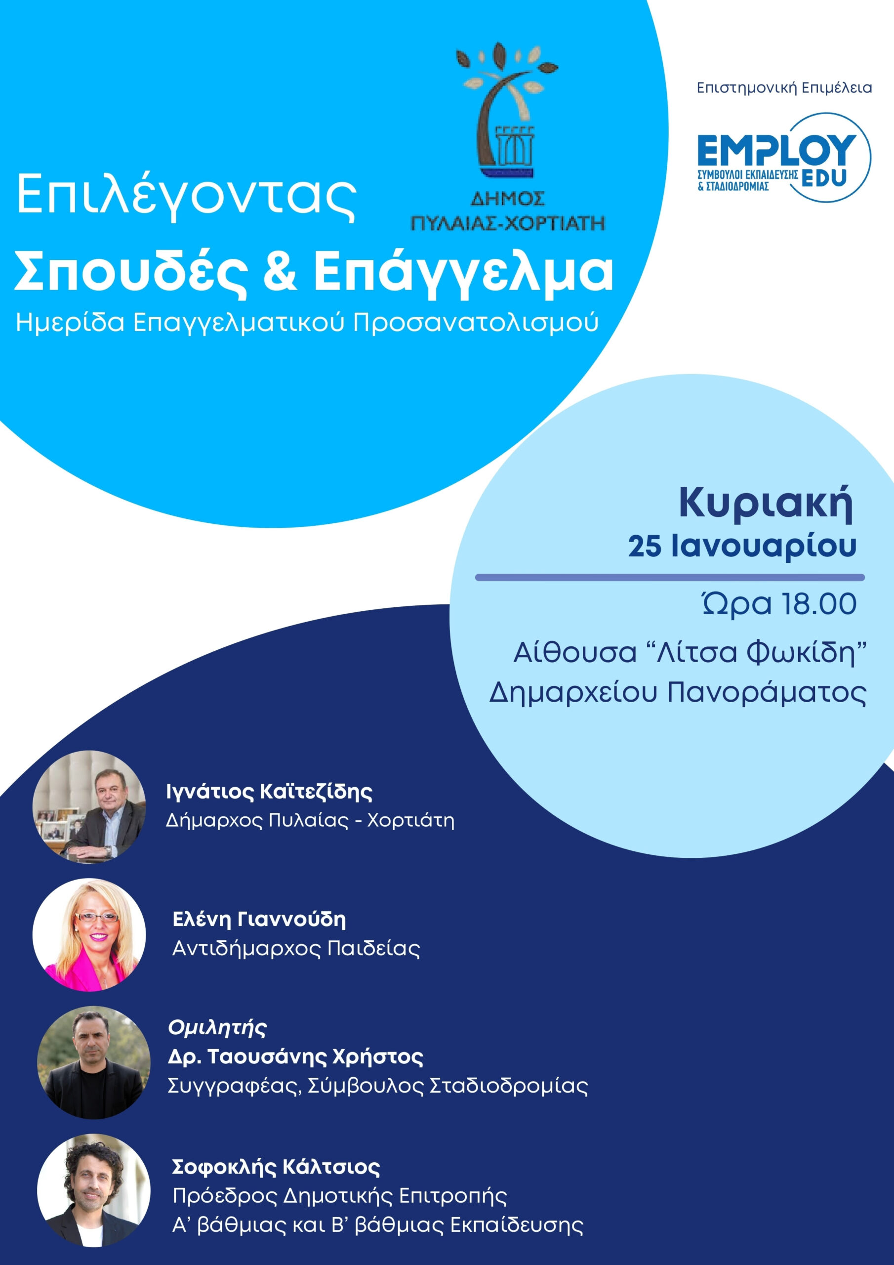 Ενημερωτική ημερίδα με θέμα «Επιλέγοντας Σπουδές και Επάγγελμα» διοργανώνει ο Δήμος Πυλαίας – Χορτιάτη σε συνεργασία με την εταιρεία EMPLOY EDU – Σύμβουλοι Εκπαίδευσης και Σταδιοδρομίας, την Κυριακή 25 Ιανουαρίου στις 6 το απόγευμα, στο Δημαρχείο Πανοράματος (αίθ. Λίτσα Φωκίδη).