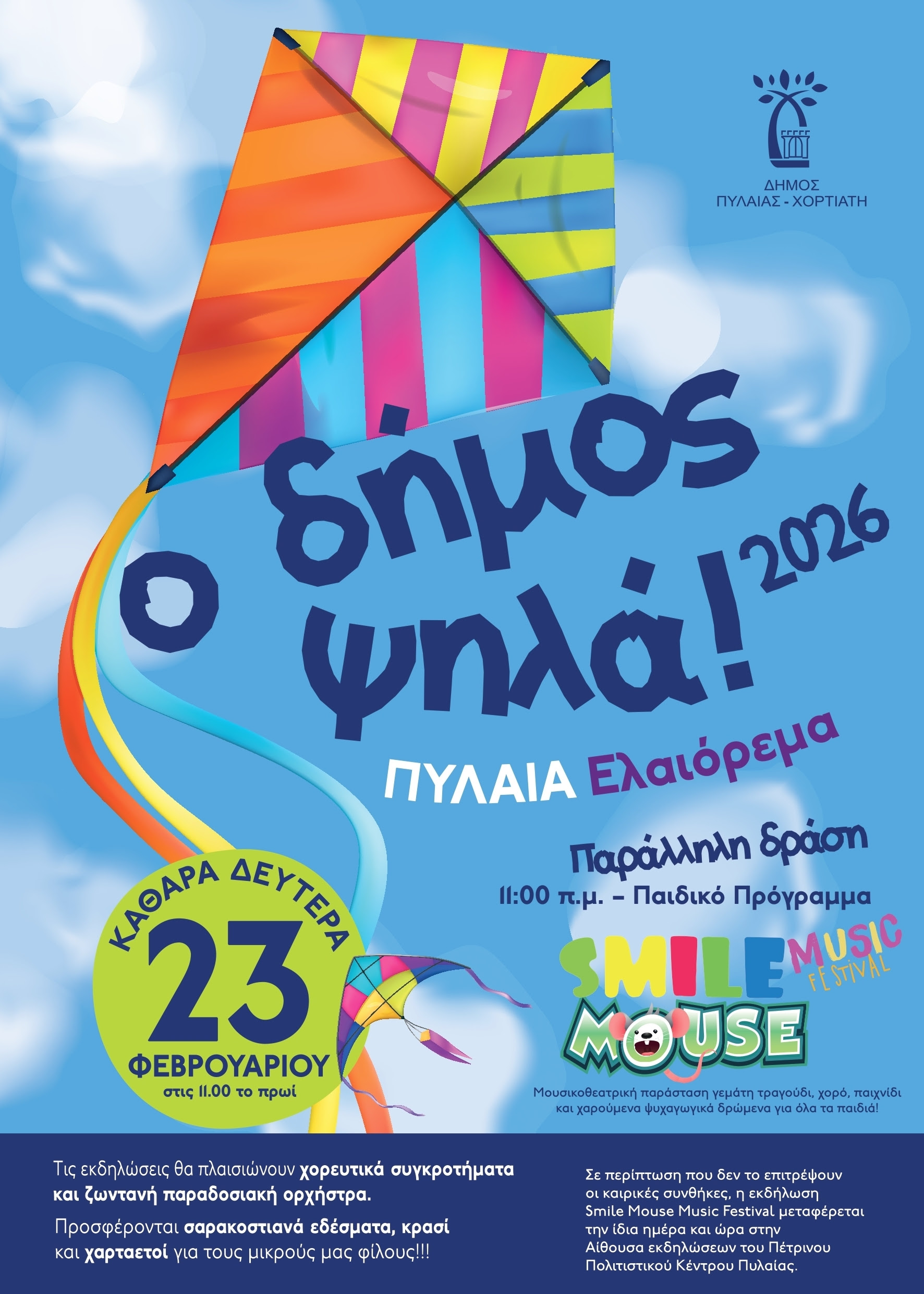 Με τον χαρακτηριστικό τίτλο «Ο δήμος ψηλά!» και το παραδοσιακό πέταγμα του χαρταετού, ο Δήμος Πυλαίας – Χορτιάτη προσκαλεί τους κατοίκους του Δήμου και όλους τους Θεσσαλονικείς να γιορτάσουμε μαζί τα «Κούλουμα 2026», την Καθαρά Δευτέρα 23 Φεβρουαρίου στις 11.00 π.μ., στο Ελαιόρεμα στην Πυλαία.