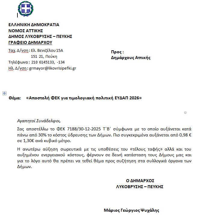 Πιο συγκεκριμένα, σύμφωνα με την επίμαχη απόφαση (ΦΕΚ 718830-12-2025 Τ΄Β΄), η οποία αιτιολογείται ως οικονομικά και δημοσιονομικά επιβεβλημένη, επιφέρεται αύξηση της τάξης περίπου 30% στην τιμή του νερού των Δήμων καθιστώντας σημαντικά δυσχερή τη διαχείριση των οικονομικών της Τοπικής Αυτοδιοίκησης. Ως εκ τούτου, η Τοπική Αυτοδιοίκηση και οι Δήμοι έρχονται πλέον σε κατάσταση οικονομικού συναγερμού, με ανησυχητικές και απρόβλεπτες τις μελλοντικές συνέπειες για τους οικονομικούς προϋπολογισμούς τους και τη δυνατότητα άσκησης από μέρους τους βασικών υπηρεσιών κοινωνικής πολιτικής προς τους δημότες.