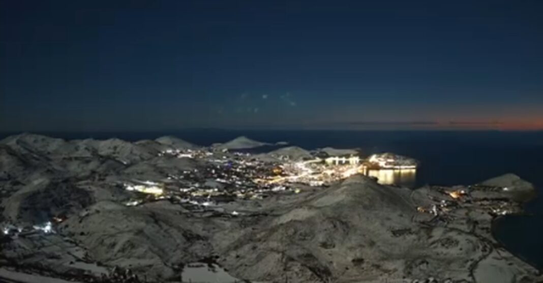 Από ψηλά, η πόλη φωτίζεται σταδιακά με το χιόνι να καλύπτει λόφους, στέγες και δρόμους, δημιουργώντας ένα σπάνιο χειμωνιάτικο σκηνικό. Χιόνι απλωμένο παντού και γύρω γύρω η θάλασσα!