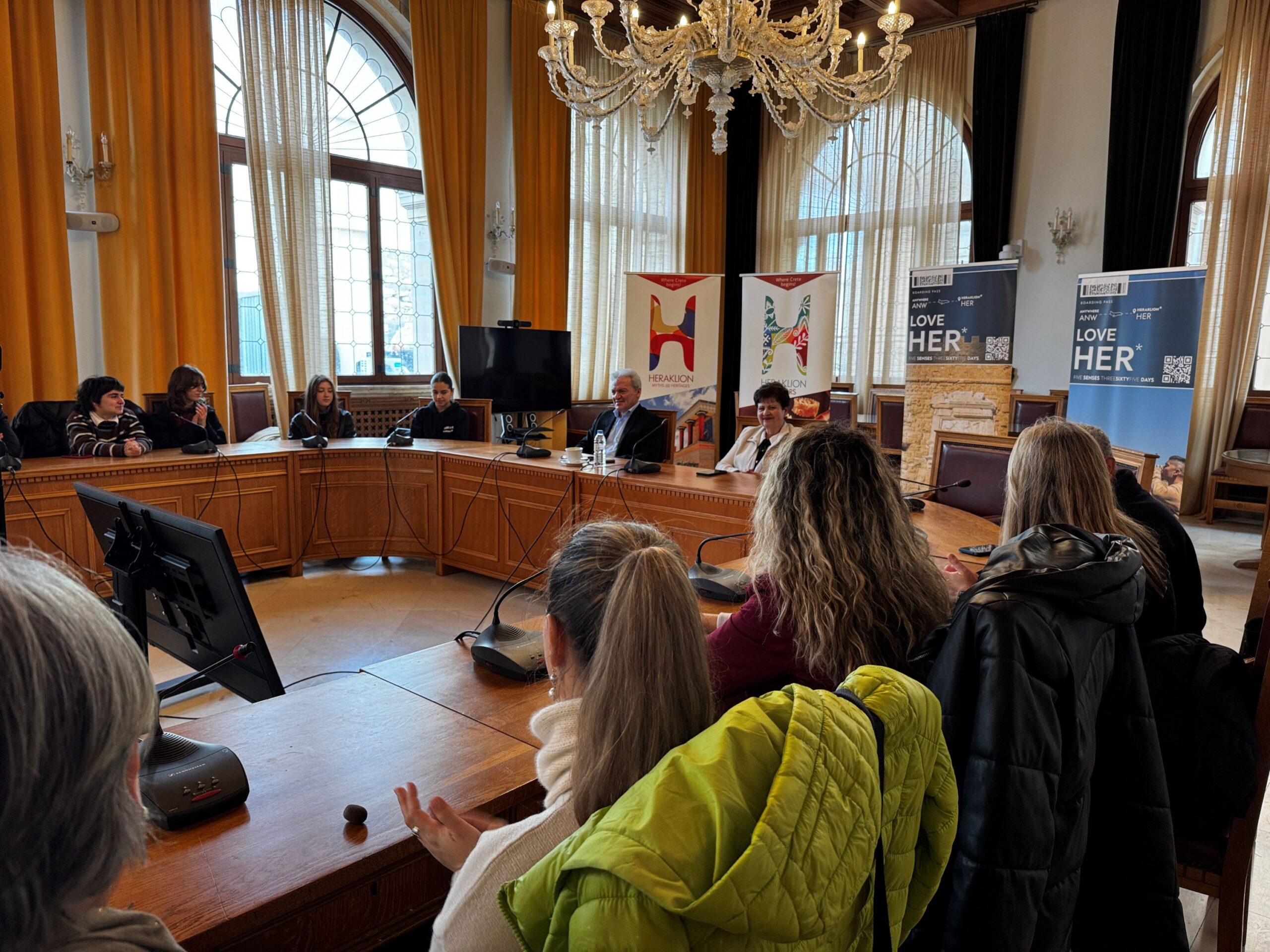 Ο Αλέξης Καλοκαιρινός καλωσόρισε τους επισκέπτες στην αίθουσα «Ελευθέριος Βενιζέλος» και συνομίλησε μαζί τους για την ιστορία της πόλης, κάνοντας ιδιαίτερη αναφορά στα Ενετικά Τείχη. Στο πλαίσιο της συζήτησης, ο Δήμαρχος Ηρακλείου μίλησε στους μαθητές και για την σημασία της καλλιέργειας μιας κοινής ευρωπαϊκής συνείδησης: