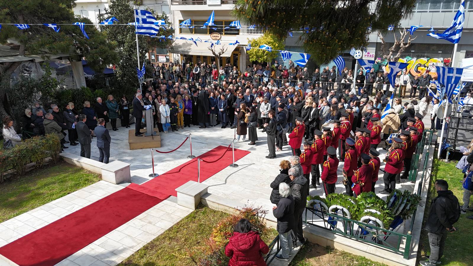 Παράλληλα, υπογράμμισε ότι ο αγώνας του 1821 δεν αποτελεί μόνο ένα ιστορικό γεγονός αλλά μια διαρκή παρακαταθήκη αξιών και ιδανικών για τον ελληνισμό, όπως η ελευθερία, η ενότητα, η πίστη και η συλλογική ευθύνη. Στον λόγο του αναφέρθηκε επίσης στη σημαντική συμβολή των Μαρουσιωτών στους εθνικούς αγώνες, επισημαίνοντας ότι και κάτοικοι της πόλης συμμετείχαν ενεργά στην Επανάσταση του 1821, συμβάλλοντας στον κοινό αγώνα για την ελευθερία της πατρίδας.