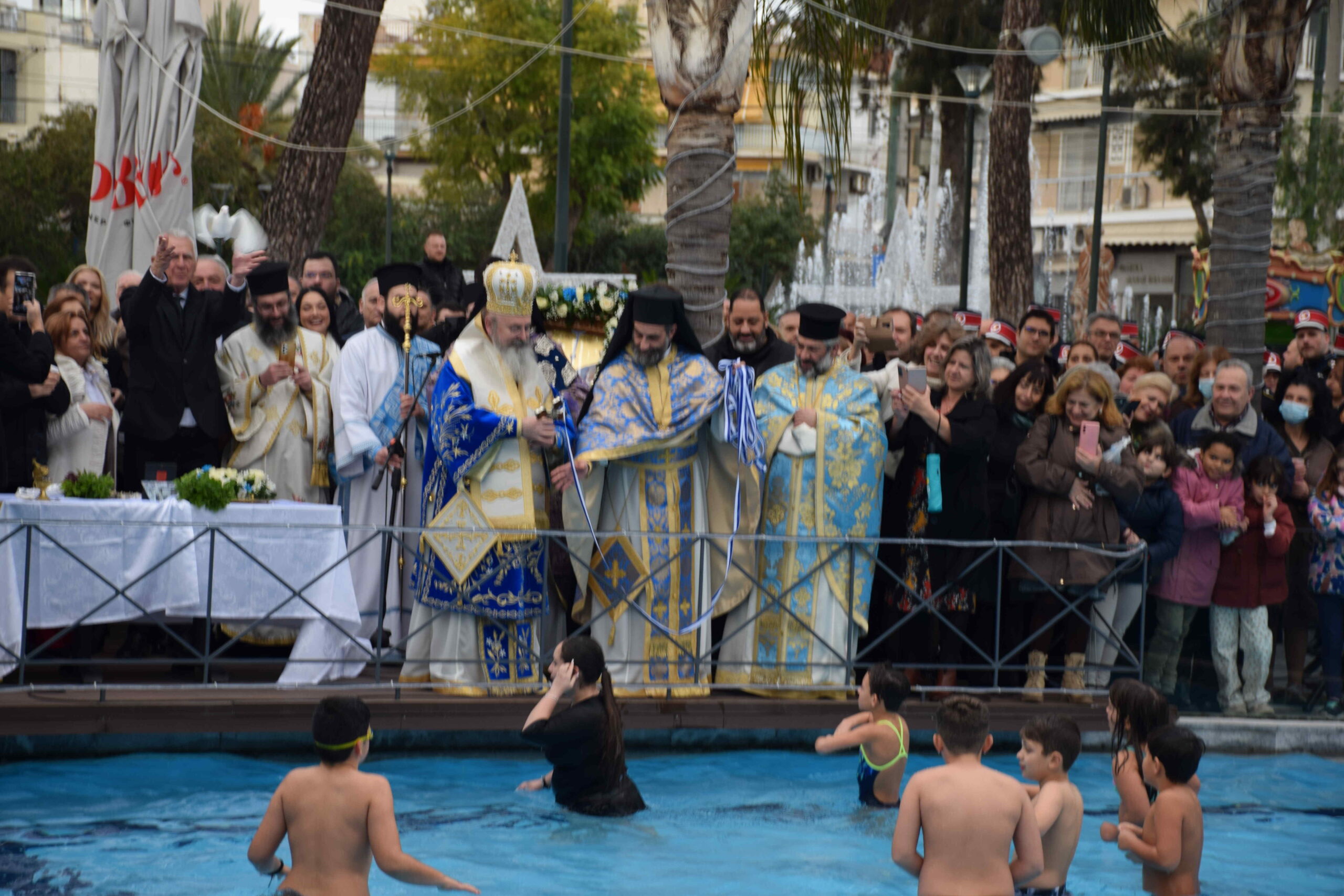 Οι θρησκευτικές τελετές τελέστηκαν στην πισίνα της 1ης Παιδικής Χαράς, στο Κολυμβητήριο Χωράφας και στο Κολυμβητήριο Λόφου Αξιωματικών, σε κλίμα κατάνυξης και σεβασμού στην ορθόδοξη παράδοση, χοροστατούντος του Σεβασμιωτάτου Μητροπολίτη Περιστερίου, κ. Γρηγορίου.