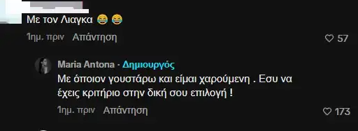 Παρά το γεγονός ότι το κείμενο αναφερόταν σε γενικές αξίες, ένας χρήστης της πλατφόρμας επέλεξε να συνδέσει τα λόγια της απευθείας με τον Γιώργο Λιάγκα, σχολιάζοντας με διάθεση ειρωνείας και γελαστά emojis: «Με τον Λιάγκα».