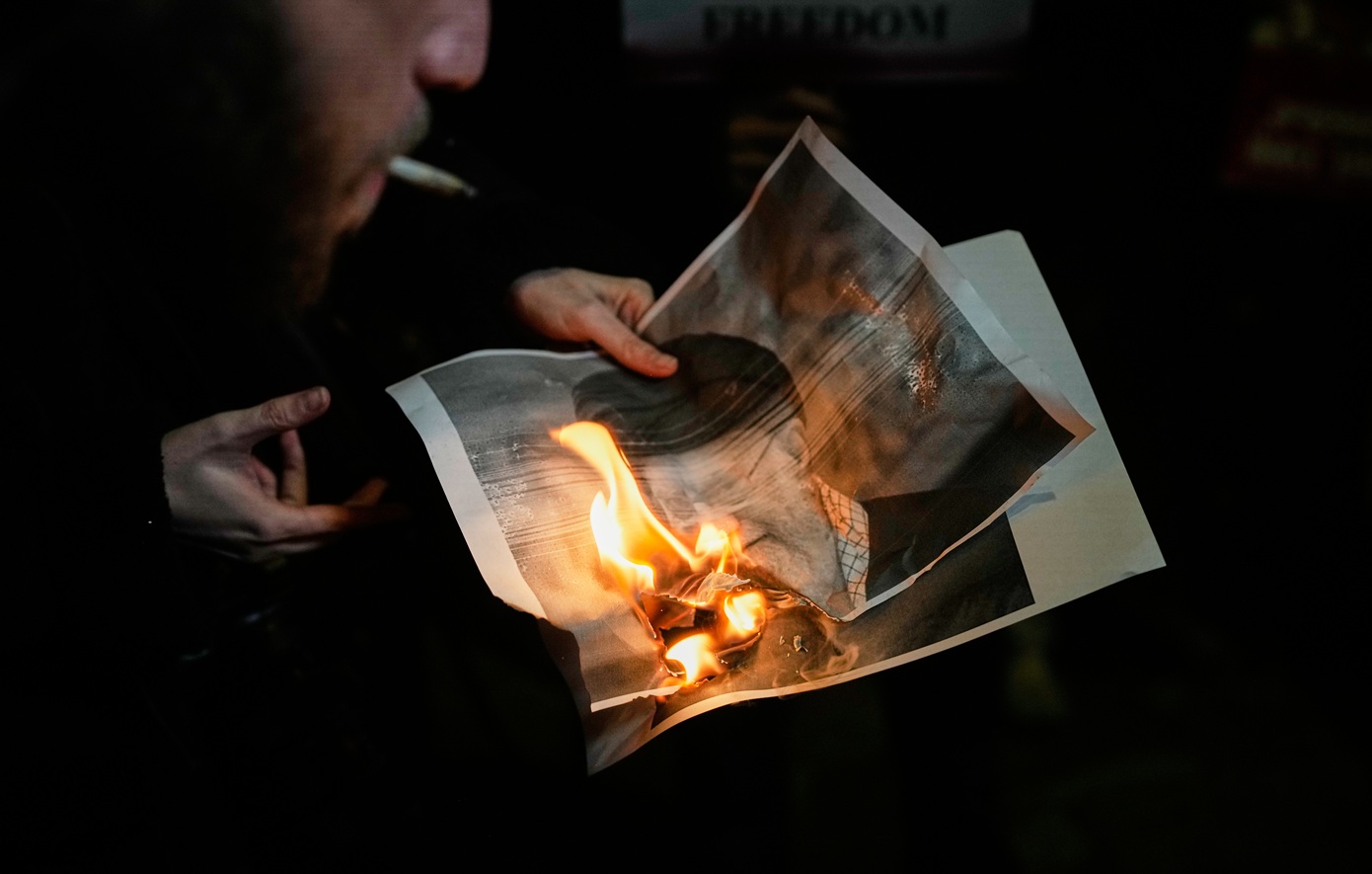 Πανό με συνθήματα «θάνατος στην Αμερική» και φωτογραφίες του ανώτατου ηγέτη, του αγιατολάχ Αλί Χαμενεΐ, φαίνονταν ανάμεσα στο πλήθος, σύμφωνα με δημοσιογράφο του AFP, όπως και μια φωτογραφία που απεικόνιζε τον Ντόναλντ Τραμπ με το πρόσωπο ματωμένο, από την απόπειρα δολοφονίας εις βάρος του το 2024, με τη λεζάντα: «Αυτή τη φορά δεν θα αστοχήσει».