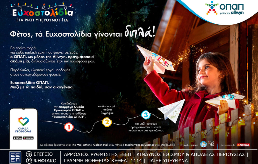 Για πρώτη φορά, ο ΟΠΑΠ – μέλος της Allwyn – ενισχύει ακόμη περισσότερο τη δράση προσφοράς. Για κάθε ευχή που πραγματοποιείται, ο ΟΠΑΠ υλοποιεί μία ακόμη, διπλασιάζοντας με αυτόν τον τρόπο τον αντίκτυπο και την αξία της πρωτοβουλίας.