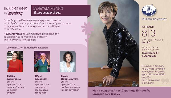 Ο Δήμαρχος Παλαιού Φαλήρου Γιάννης Φωστηρόπουλος προσκαλεί την Κυριακή 8 Μαρτίου και ώρα 19:30 στον Πολυχώρο του Δημαρχείου (Τερψιχόρης 51 &Αρτέμιδος) σε μία συναυλία με την Κωνσταντίνα, που θα ερμηνεύσει δικές της και όχι μόνο επιτυχίες.