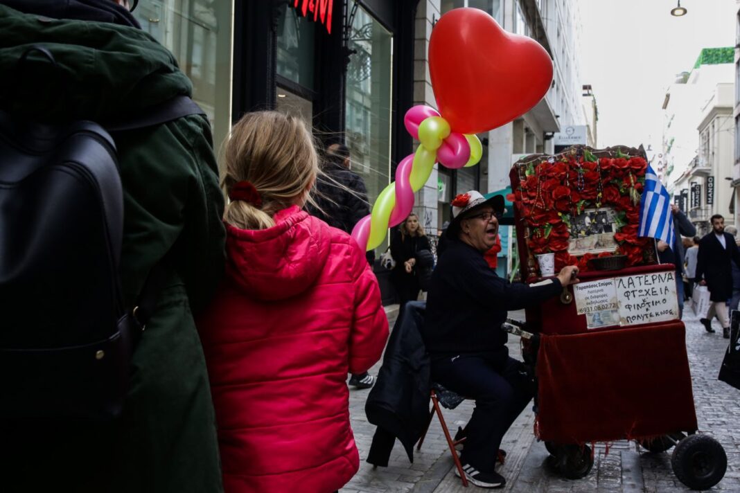 Ο Σπύρος Ταραπόσος, με τη λατέρνα του, γεμίζει την Ερμού με μελωδίες Χατζηδάκη και Θεοδωράκη, προσφέροντας μια νοσταλγική νότα στην καθημερινότητα των περαστικών.