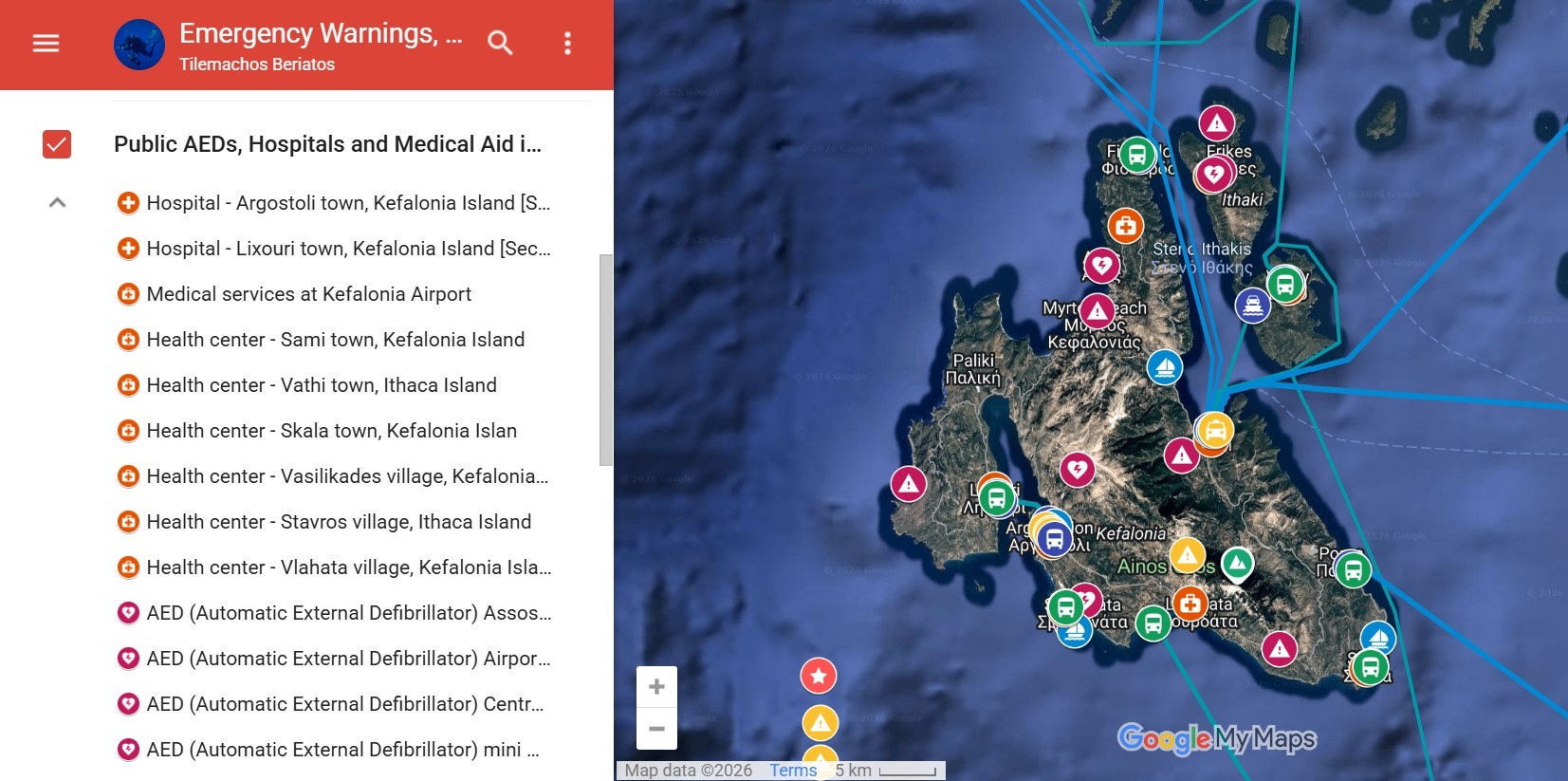 Ο διαδικτυακός αυτός χάρτης, τον οποίο έχει επιμεληθεί και δημοσιεύσει από το 2022 ο κ. Τηλέμαχος Μπεριάτος, απεικονίζει Έκτακτες Προειδοποιήσεις, Δομές Ιατρικής βοήθειας & Πύλες εισόδου και δίκτυα συγκοινωνιών, στην Κεφαλονιά και την Ιθάκη, ευελπιστώντας να γίνει ένα καθημερινό εργαλείο για την διευκόλυνση του κατοίκου και του επισκέπτη.