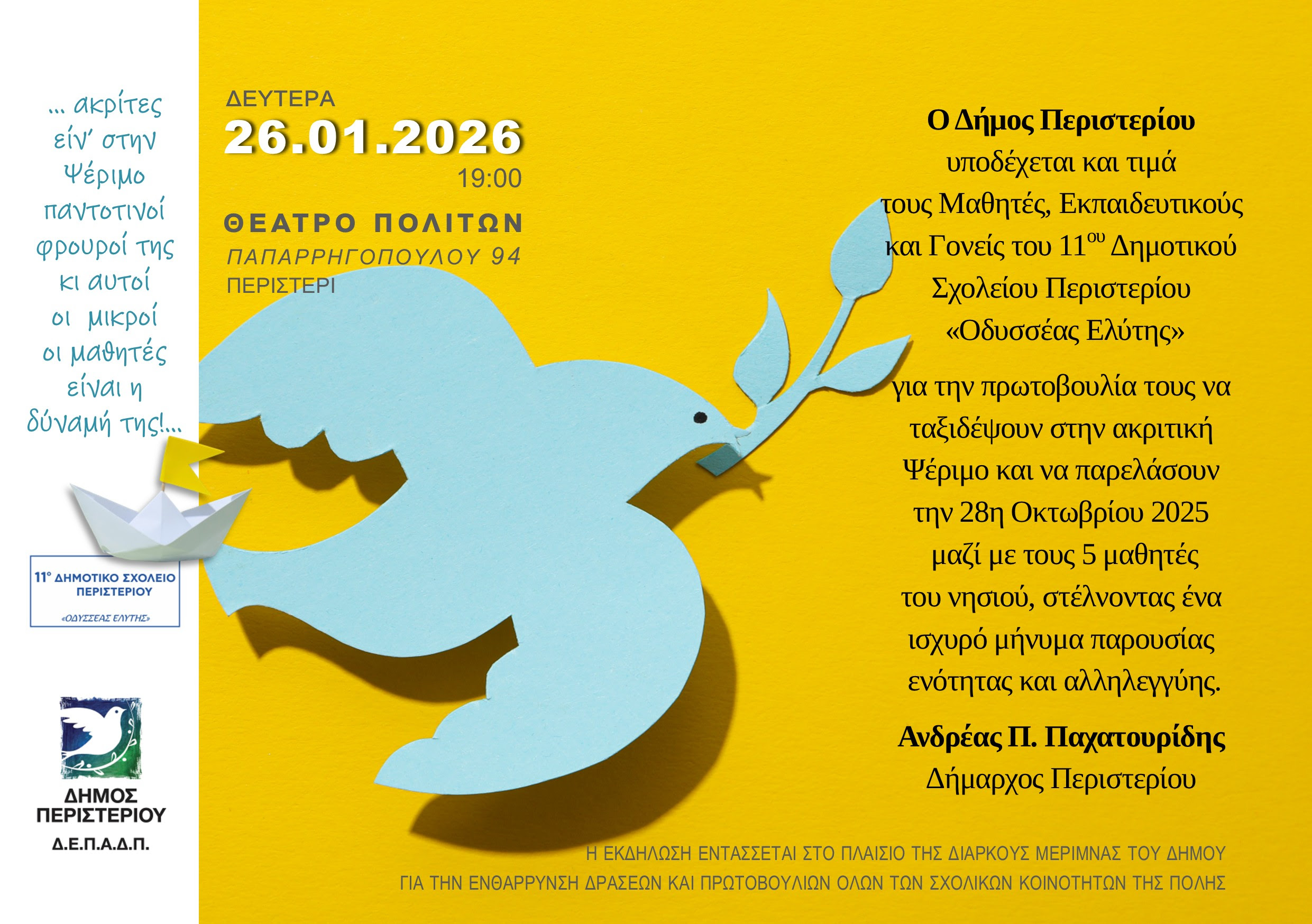 Ο Δήμαρχος Περιστερίου, Ανδρέας Π. Παχατουρίδης, τιμά τη σχολική κοινότητα για την πρωτοβουλία της να ταξιδέψει στην ακριτική Ψέριμο και να συμμετάσχει στην παρέλαση της 28ης Οκτωβρίου 2025, μαζί με τους πέντε μαθητές του νησιού, στέλνοντας ένα ισχυρό μήνυμα παρουσίας, ενότητας και αλληλεγγύης.