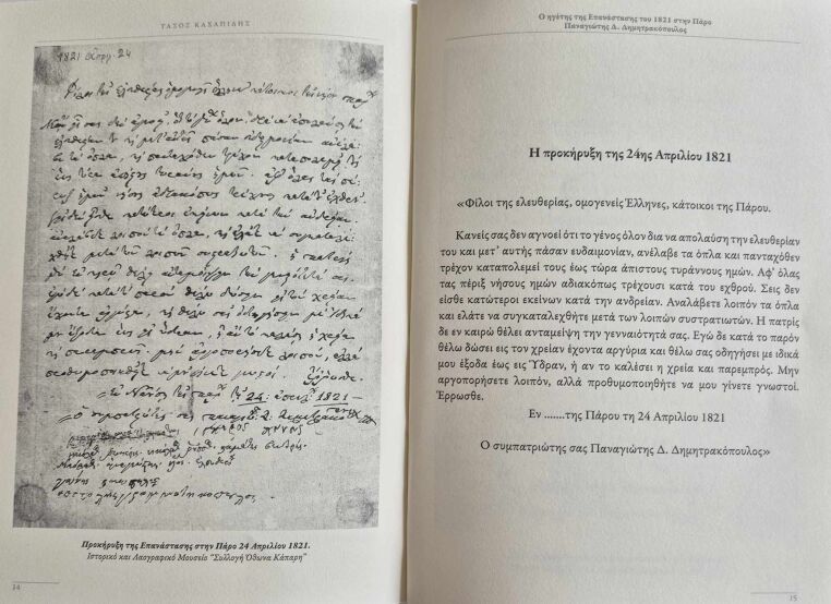 Η 24η Απριλίου αποτελεί για την Πάρο ημέρα ιστορικής μνήμης και εθνικής υπερηφάνειας. Στις 24 Απριλίου του 1821, ο Παναγιώτης Δημητρακόπουλος, επικεφαλής της Φιλικής Εταιρείας στο νησί μας, με προκήρυξή του προς τους Παριανούς, ύψωσε το λάβαρο της Επανάστασης και κήρυξε την έναρξη του Αγώνα στην Πάρο, εντάσσοντας το νησί μας στη μεγάλη εθνική προσπάθεια για την αποτίναξη του